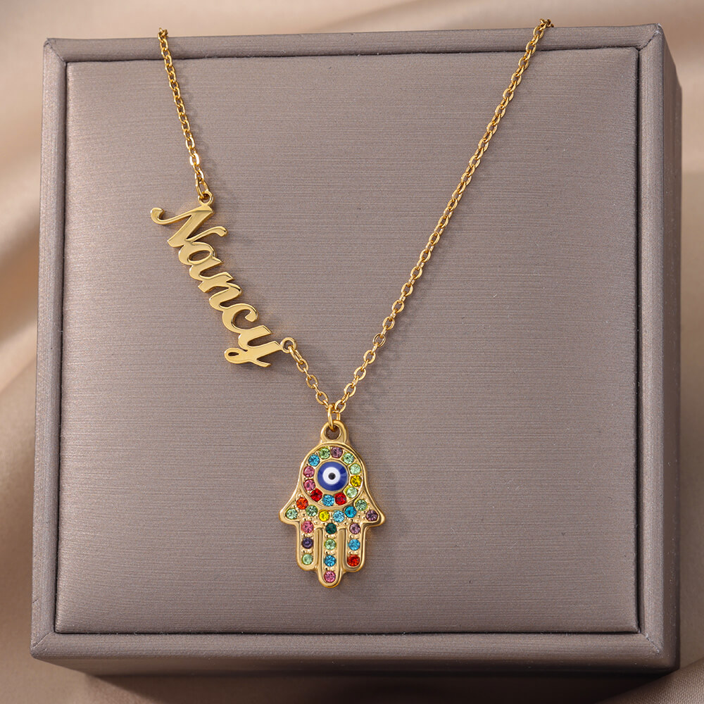 Personalized Name Letter Necklaces For Women With Zircon Hamsa Hand Custom Name Evil Eye Necklace Christmas Aesthetic Jewelry Silver Color-37cm-Style2(Choose Font) – Sumsfashion